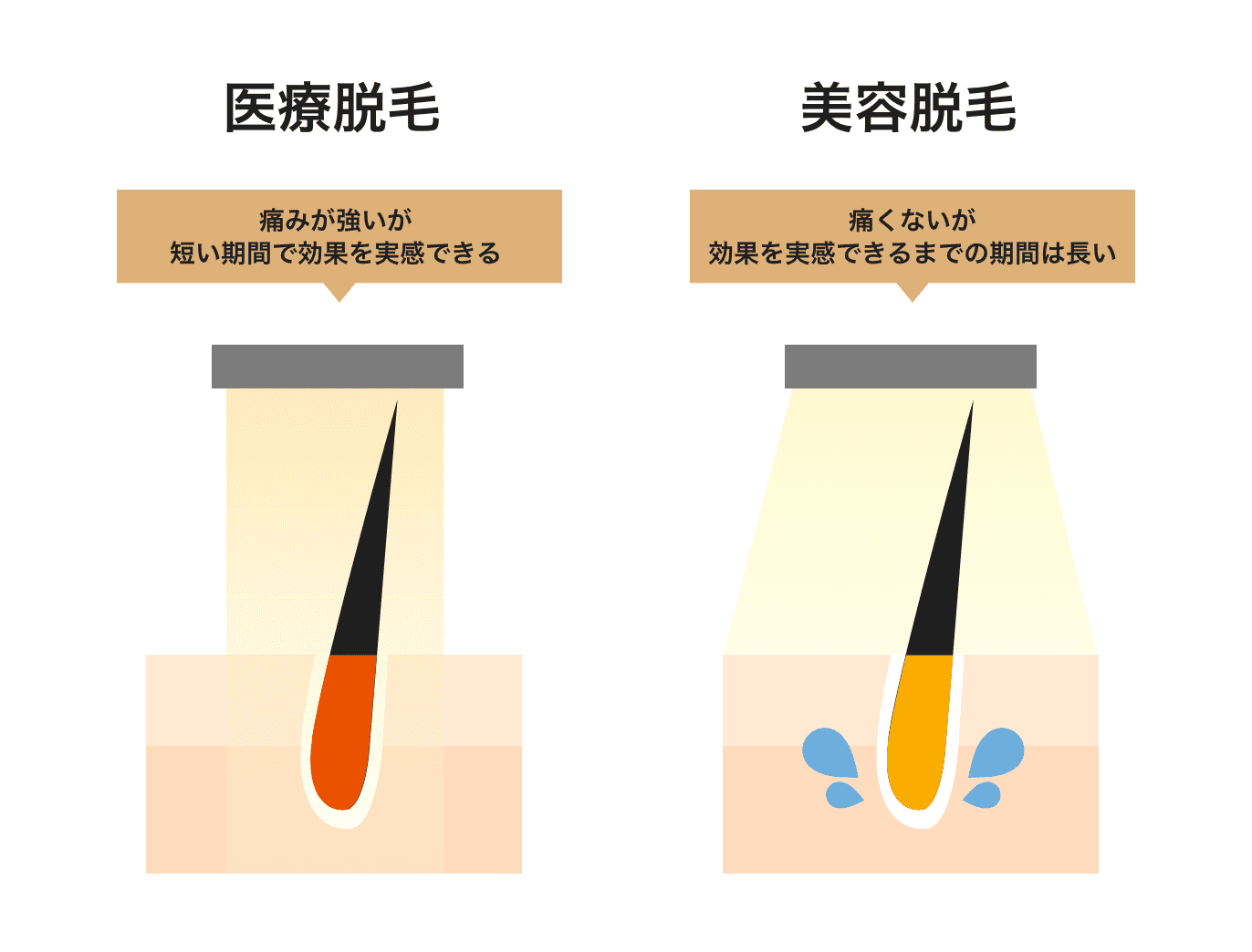 医療脱毛は医療レーザーを使用するため高出力で効果が高く、美容脱毛は光(IPL)を使用するため穏やかな効果です。永久脱毛を目指すなら医療脱毛、徐々に薄くしたいなら美容脱毛が適しています。